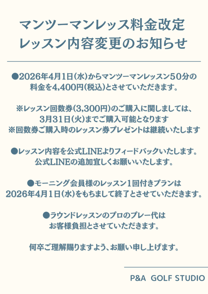 【マンツーマンレッスン料金改定・レッスン内容変更のお知らせ】
